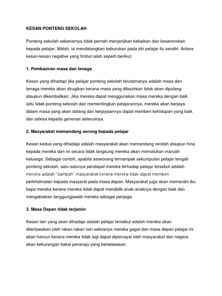 Menjadi faktor penarik kepada masalah ponteng sekolah. Contoh Karangan Punca Ponteng Sekolah. Ponteng sekolah merupakan salah satu masalah disiplin yang semakin ketara.